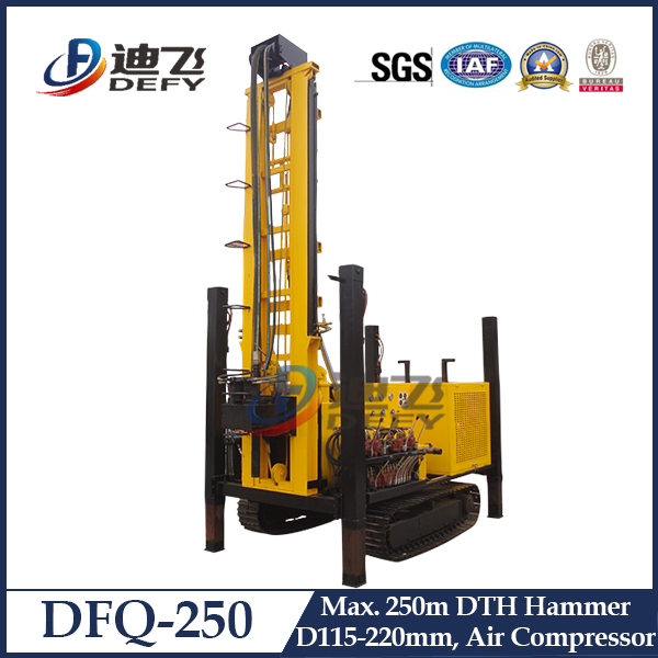 DFQ-250 drilling rig is a light weight, high efficiency and multi-function drilling equipment, it adopts rubber crawler, will not damage the roads, self-propelled transitions,convenient and quick. It is widely used for water well drilling,geothermal air-conditioning project and other boreholes, especially applicable to mountain area and rock formation water engineering.Much higher efficient than the traditional rotary drill rigs, creating the considerable economic benefit for users. DFQ-250 drilling machine is able to work efficiently under all kinds of geological conditions. DFQ series penumatic well drilling rig is very popular in market from Kenya, Nigeria, Ethopia, Mombasa, Uganda, South Africa, Zimbabwe, Chile, Peru, Malaysia, Dominica, India, etc.